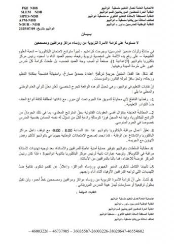 وأعربت النقابات عن تأييدها الكامل لشكوى المدير الجهوي ورؤساء المراكز، كما أعلنت تقديم شكوى نقابية ضد التهديدات التي تواجه المراقبين الأوفياء أثناء تأدية واجبهم، مشددة على أن كرامة الأسرة التربوية من رؤساء المراكز والمراقبين المصححين خط أحمر.