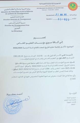 أصدرت وزارة التربية وإصلاح النظام التعليمي تعميمًا يلزم جميع مؤسسات التعليم الخاص باحترام الموعد الرسمي لافتتاح السنة الدراسية 2025-2026، والمحدد يوم الاثنين 6 أكتوبر 2025.