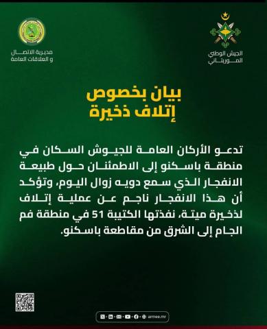 ودعت الأركان العامة للجيوش المواطنين إلى الاطمئنان، مؤكدة أن العملية تمت تحت السيطرة الكاملة وبشكل آمن.