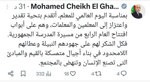 تقدم الرئيس محمد ولد الشيخ الغزواني بتحية تقدير واعتزاز إلى المعلمين والمعلمات، بمناسبة اليوم العالمي للمعلم.