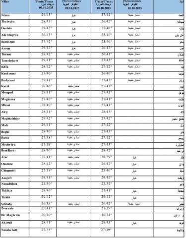وقالت الهيئة إن الأمطار ستكون خفيفة الى معتدلة على الحوضين وجنوب اترارزة ولبراكنه وإينشيري وآدرار وكيدي ماغه وكوركول ولعصابة وتكانت