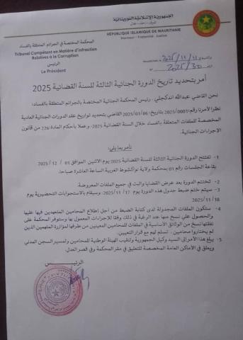 أصدر رئيس المحكمة الجنائية المختصة في الجرائم المتعلقة بالفساد، القاضي عبد الله اندگجلي، أمراً قضائياً بتحديد موعد انعقاد الدورة الجنائية الثالثة للسنة القضائية 2025، وذلك ابتداءً من الاثنين 1 ديسمبر 2025 عند الساعة العاشرة صباحاً بقاعة الجلسات رقم (01) في قصر العدل بولاية نواكشوط الغربية.