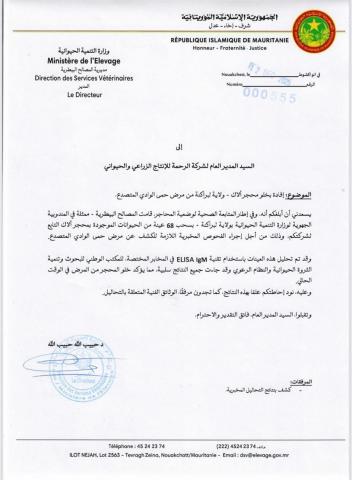 وقد قامت المصالح البيطرية، ممثلة في المندوبية الجهوية لوزارة التنمية الحيوانية بولاية لبراكنة، بسحب 68 عينة من الحيوانات الموجودة بالمحجر، وذلك لإجراء الفحوص المخبرية اللازمة للكشف عن المرض. وتم تحليل هذه العينات في المخابر المختصة التابعة للمكتب الوطني للبحوث وتنمية الثروة الحيوانية والنظام الرعوي، باستخدام التقنيات المعتمدة.