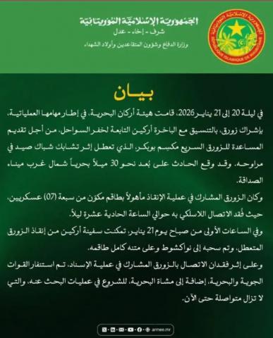 أعلنت هيئة أركان البحرية أن زورقًا عسكريًا فقد الاتصال به، ليلة 20 إلى 21 يناير، أثناء مشاركته في عملية إنقاذ زورق صيادين تعطل قبالة السواحل الموريتانية.