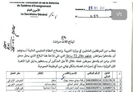 وقالت الوزارة، في بلاغ صادر عنها، إن من لم يلتحق بعمله خلال الأجل المحدد، أو لم يقدم ما يثبت وجود قوة قاهرة، ستباشر بحقه إجراءات الفصل النهائي من الوظيفة العمومية.