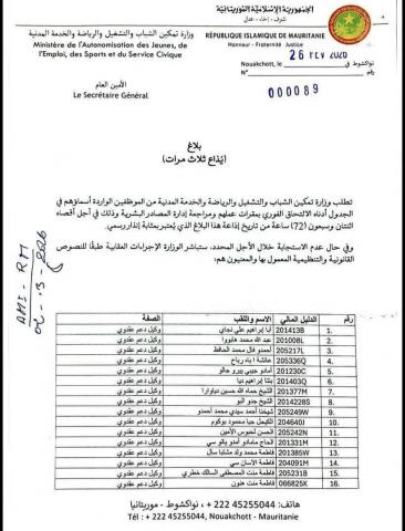 وجهت وزارة تمكين الشباب والتشغيل والرياضة والخدمة المدنية إشعارات إلى 64 موظفًا تطالبهم بالالتحاق الفوري بمقار عملهم ومراجعة إدارة المصادر البشرية.