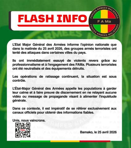 وكانت هيئة الأركان قد أعلنت في بيان سابق اليوم أن "مجموعات مسلحة إرهابية لم يتم التعرف عليها بعد، استهدفت في وقت مبكر من صباح يوم 25 أبريل 2026 بعض النقاط والثكنات في العاصمة وفي الداخل"، مؤكدة أن قوات الدفاع والأمن تتصدى للمهاجمين.