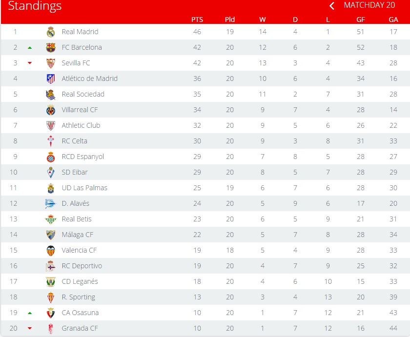 فيما يلى.. جدول ترتيب الدورى الإسبانى بعد الجولة الـ20 باستثناء مباراة لاس بالماس وفالنسيا: