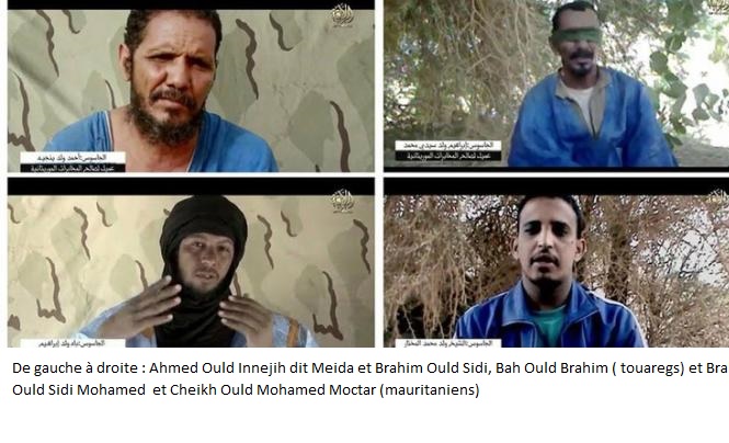 Les premiers à intervenir sont les deux Mauritaniens à savoir Ibrahim Ould Sidi Mohamed et Cheikh Ould Mohamed Mokhtar. Dans cette vidéo, le groupe admet également avoir exécuté pour les mêmes faits deux Maliens répondant aux noms de Ahmed Ould Inajih et Oubah Ould Ibrahim, tous deux ressortissants de la tribu arabe « Alwasra ».