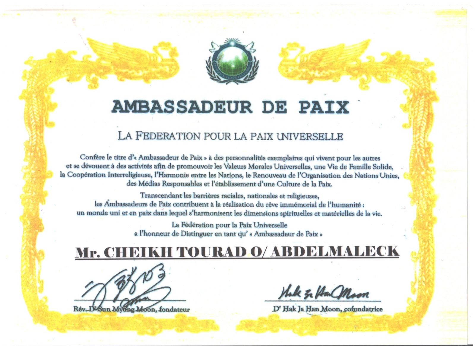 Le titre d’ambassadeur de la paix dans le monde initié par la Fédération pour la Paix Universelle (FPU), une Ong à statut consultatif spécial auprès du Conseil Economique et Social