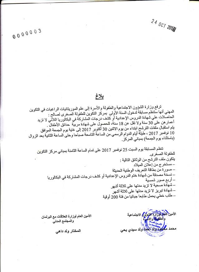 أعلنت وزارة الشؤون الاجتماعية و الطفولة و الأسرة أن مركز التكوين للطفولة للصغرى سيقوم بمسابقة خاصة بالفتيات الموريتانيات الراغبات في التكوين في مجال الطفولة الصغرى و دخول السنة أولى من مركز التكوين للطفولة الصغرى وذيك اللواتي لا تتجاوز أعمارهن 30 سنة و لا تقل عن 18 سنة .