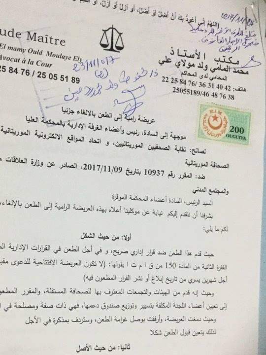 وافق القاضي السيد سيدي ابراهيم ولد محمد ختار، رئيس الغرفة الادارية بالمحكمة العليا على قبول الطعن شكلا ضد المقرر رقم 10937 الصادر عن وزارة العلاقات مع البرلمان والمجتمع المدني، بتاريخ 09 نوفمبر 2017، بتعيين أعضاء اللجنة المكلفة بتسيير وتوزيع صندوق دعم الصحافة الخاصة ..