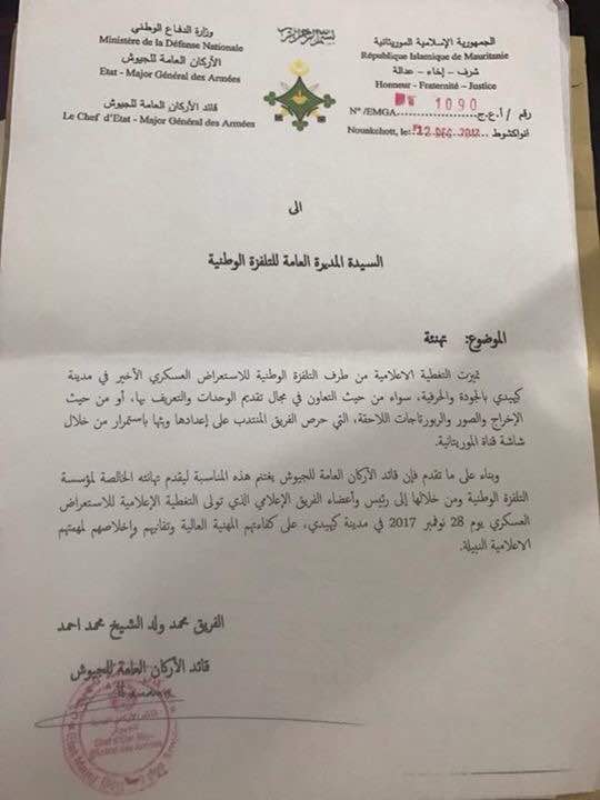 وجّه الفريق محمد ولد الشيخ محمد احمد قائد الاركان العامة للجيوش رسالة تهنئة الى الدكتورة خيرة منت شيخاني مديرة التلفزة الموريتانية بمناسبة نجاح القناة وحِرَفيتها في تغطية العرض العسكري الذي جرى يوم الثامن والعشرين ,ذكرى عيد الاستقلال المجيد ,في مدينة كيهيدي.