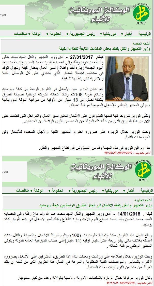 وفى سياق منفصل واثناء تغطيتها للزيارة التي يقوم بها الوزير الحالي محمد عبد الله ولد أداعة لنفس الطريق نقلت الوكالة عنه قوله ان الطريق ممول بغلاف مالي قدره 14 مليار أوقية, الشيء الذي طرح عدة تساؤلات حول التناقض الواضح في تصريحات المسؤولين.