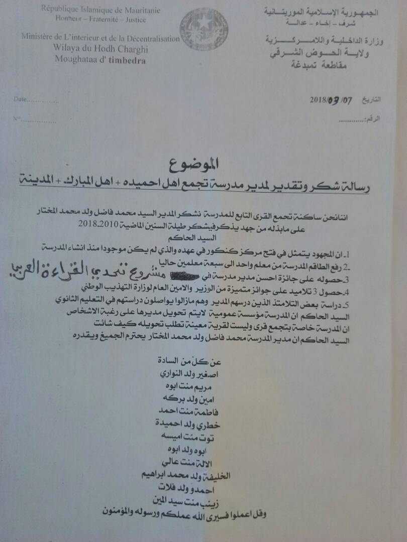 جاء ذلك في رسالة شكر تقدم بها بعض اباء التلاميذ الى حاكم المقاطعة, مؤكدين فيها على مواظبة مدير المرسة على التدريس للتلاميذ وتمسكهم به.