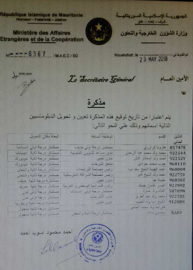 اجرى وزير الخارجية اسلكو ولد أحمد ازدبيه تغييرات في وزارة الخارجية بعد اجتماع عقده اليوم الأربعاء ٢٣ مايو ٢٠١٨ مع رئيس الجمهورية محمد ولد عبد العزيز.