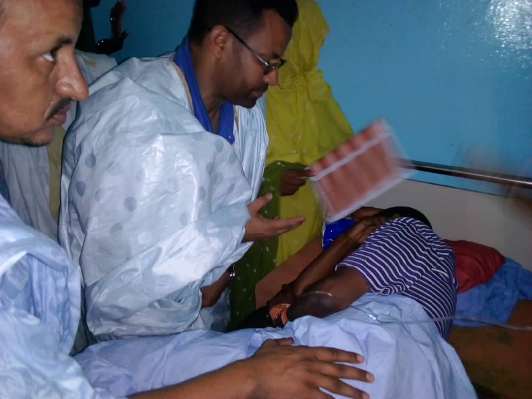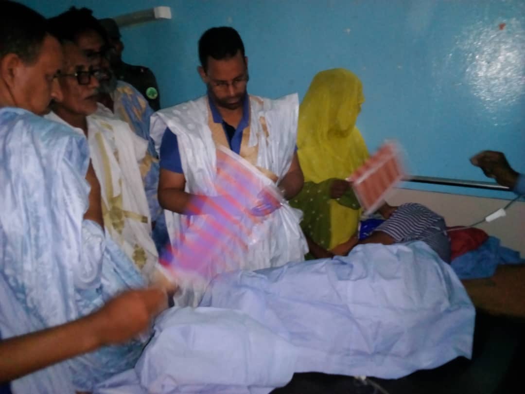 ومن جهة أخرى أدى السيد الشيخ محمد ولد الشيخ سيديا مساء اليوم زيارة عيادة لجرحى حوادث السير التي وقعت ليلة البارحة في عدة مناطق من الولاية أسفرت عن جرح ٣٧ مصابا حالة بعضهم خطرة حيث اطمأن على حالتهم وعبر لهم ولذويهم عن تمنياته لهم بالشفاء وأعطى تعليماته للطاقم الطبي المشرف على علاجهم بالمستشفى الجهوي في النعمة بضرورة العمل على توفير كل ما يلزم لمعالجتهم.