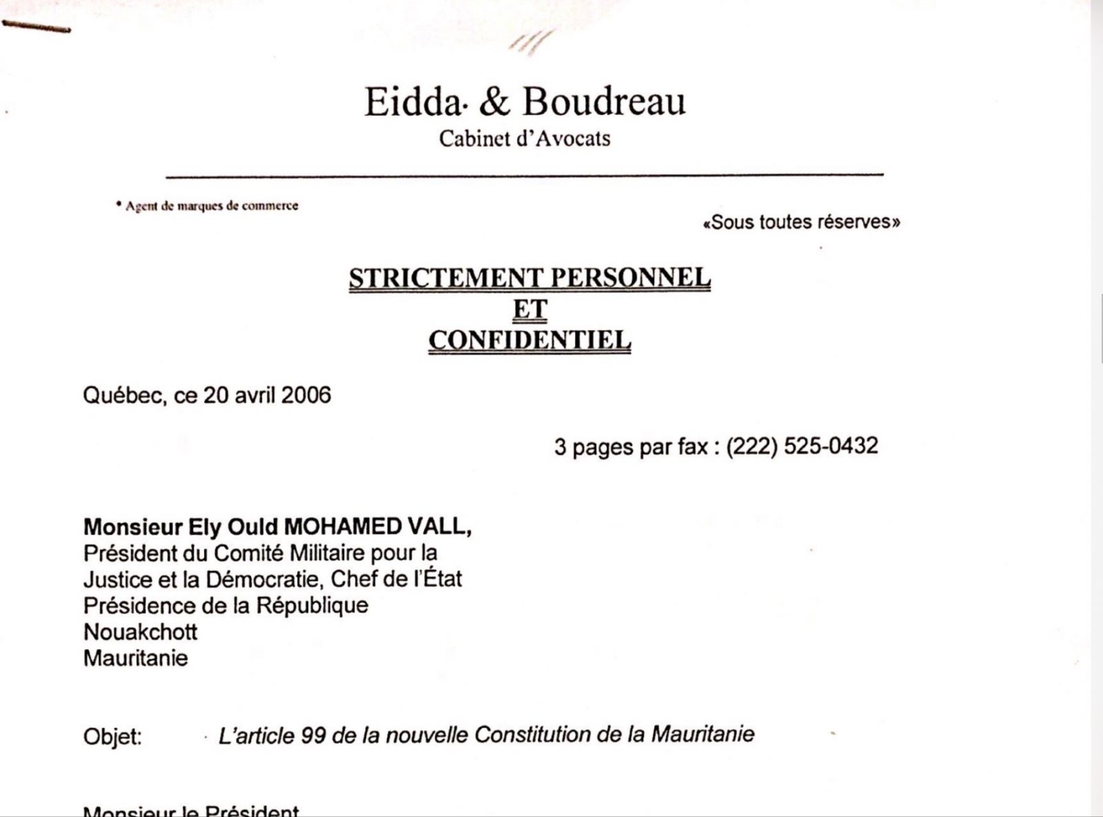 كشفت رسالة موجهة بتاريخ 20 ابريل 2006 إلى الرئيس السابق اعل ولد محمد فال، عن وجود ثغرة يمكن أن تستخدم مستقبلا لتعديل المواد المتعلقة بمنع أكثر من مأموريتين رئاسيتين.