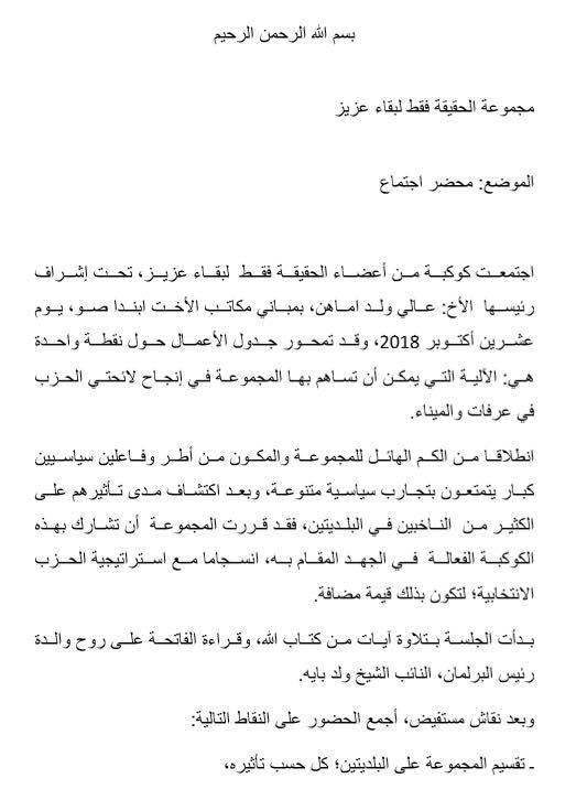 قرت مجموعة "الحقيقة فقط لبقاء عزيز" و هي مجموعة ناشطة في موقع التواصل الاجتماعي (وات ساب) ، القيام بخطة عمل مفصلة لدعم لائحتي حزب الاتحاد من أجل الجمهورية في الشوط الإضافي (الثالث) من الاقتراع البلدي في مقاطعتي الميناء وعرفات؛ حيث توزع أعضاء المبادرة ومنتسبوها إلى فريقين يتولى كل منهما الأنشطة التعوبية في إحدى المقاطعتين.