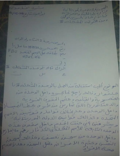 وأضاف والداه في وثيقة الاستقالة التي وجهها للرائد قائد الفرقة الحرس العاملة "بساحل" العاج "اسويدات ولد فيس" أن هناك دكتاتورية وهضم للحقوق يمارسها بعض الضباط داخل الوحدة، وهو ما يخالف قوانين الامم المتحدة، وقوانين الدولة الموريتانية.