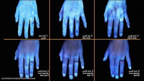 وأظهرت صورتان التقطتا لليد عن طريق الأشعة فوق البنفسجية، أن الغسل بالماء فقط لا يساعد على إزالة الجراثيم المتراكمة فوق الجلد.