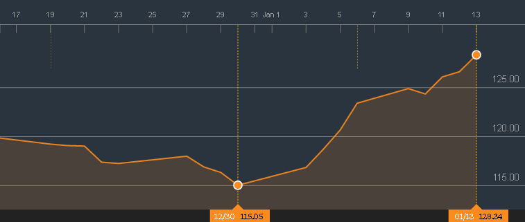 وارتفع سعر سهم "فيسبوك"، من 115.05 دولار سجلها بتاريخ 30 ديسمبر/كانون الأول، إلى 128.34 دولار سجلها بتاريخ 13 يناير/كانون الثاني، مقتربا من أعلى مستوى له على الإطلاق والذي بلغه في أكتوبر/تشرين الأول بعد أن سجل 133 دولارا.