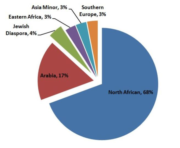 ويشمل التركيب الجيني للمواطنين المصريين النسب الآتية: 68% من شمال أفريقيا و17% من العرب، و4% من اليهود المشتتين، و3% من كل من شرق أفريقيا وآسيا الصغرى وجنوب أوروبا.