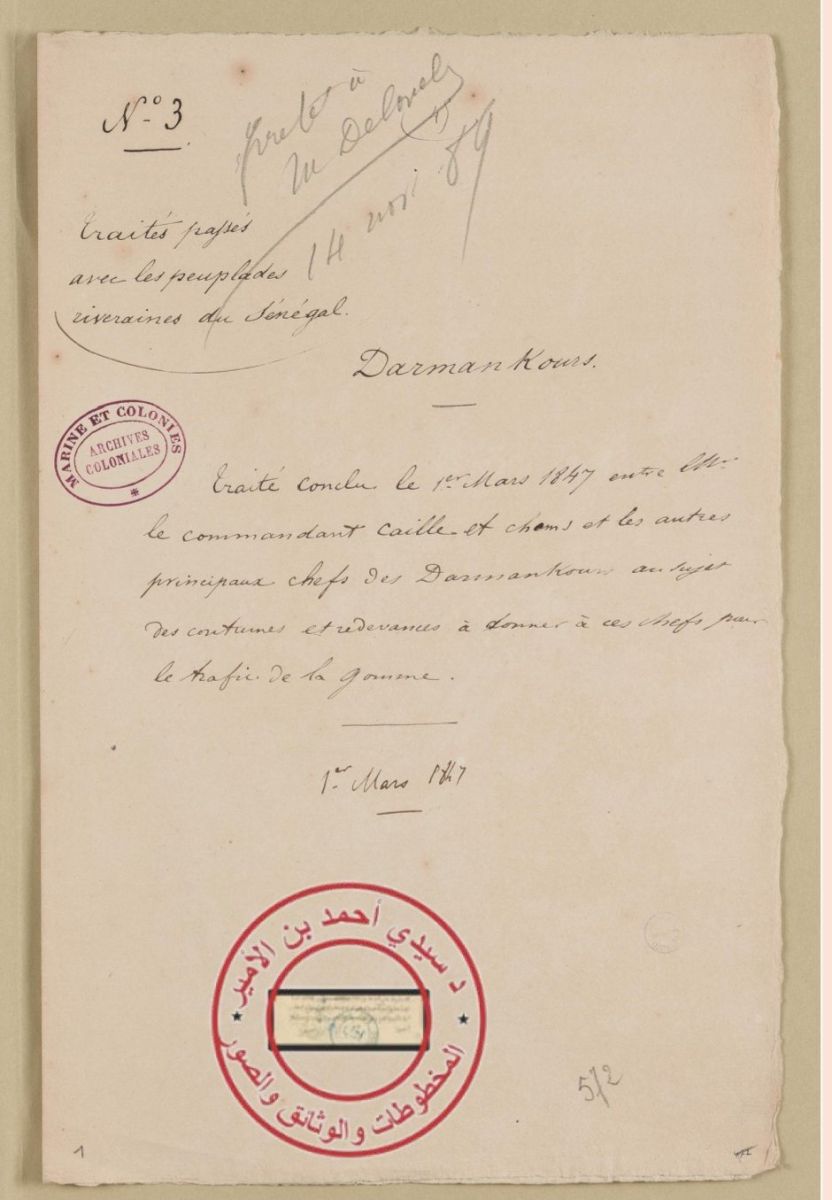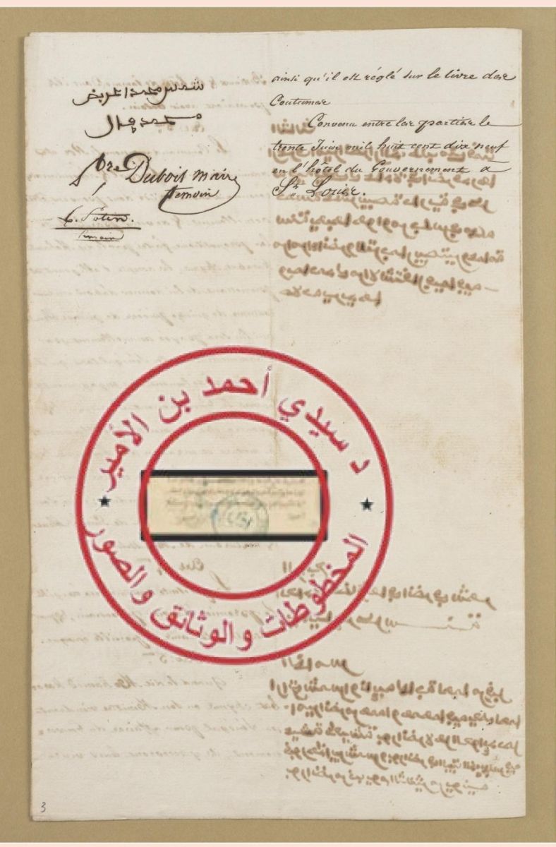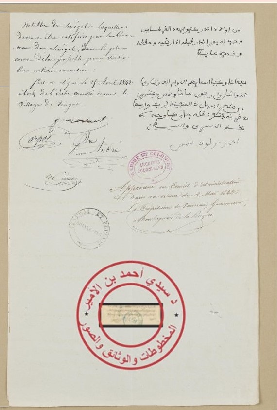 وتقع اتفاقية أبريل 1842م بين الشمس أحمد ميلود وبين الفرنسيين في صفحتين، وهي تحيين وتأكيد لاتفاقية يونيو 1817 مع جده الشمس محمذ أغربظ.