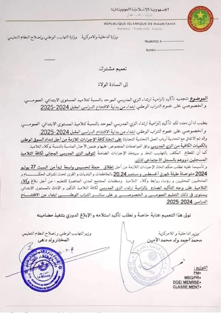 جاء ذلك خلال تعميم أصدرته الوزارة زوال اليوم أكدت فيه “الزامية ارتداء الزي المدرسي الموحد بالنسبة لتلاميذ المستوى الابتدائي العمومي والخصوصي على عموم التراب الوطني ابتداء من بداية الافتتاح الدراسي المقبل 2024-2025”.