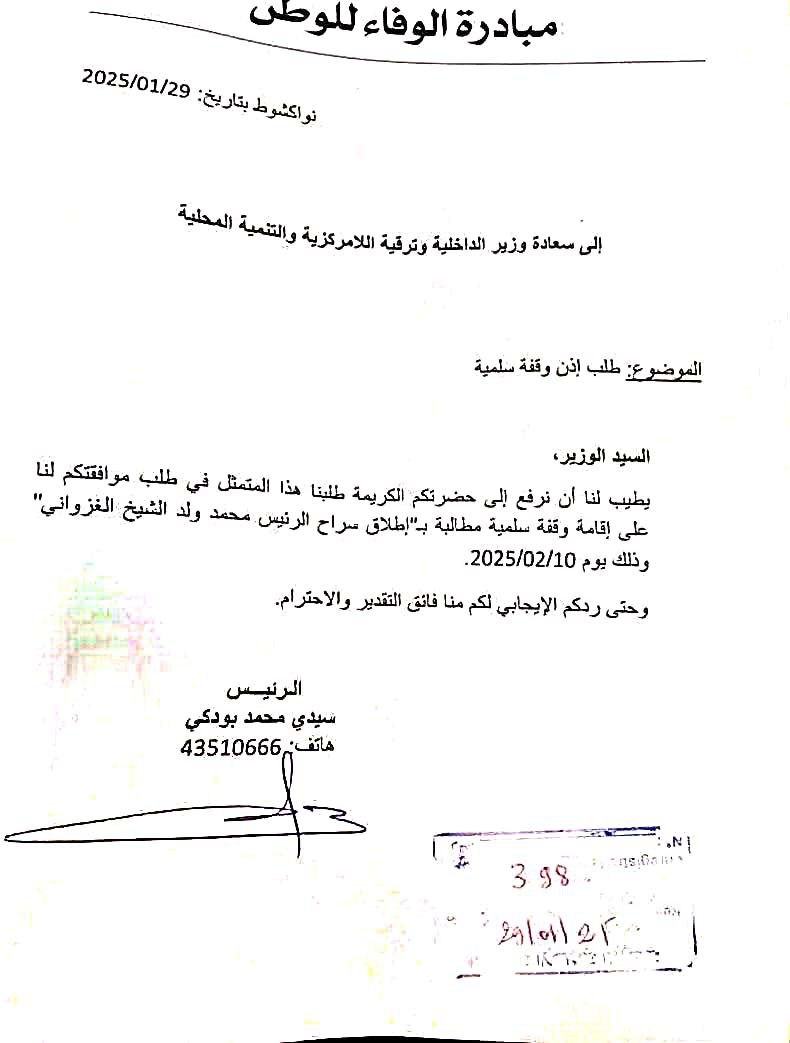 وتحمل الرسالة، المؤرخة في 29 يناير 2025، رأسية "مبادرة الوفاء للوطن"، وهي مبادرة نشأت قبيل الانتخابات الرئاسية، ونظّمت أنشطة سياسية داعمة للرئيس محمد ولد الشيخ الغزواني في يونيو 2024.