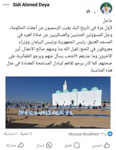 قال الوزير السابق سيدي ولد أحمد ديه انه لأول مرة في تاريخ البلد يغيب الرسميون من أعضاء الحكومة، وجل المسؤولين المدنيين والعسكريين عن صلاة العيد في المسجد العتيق.