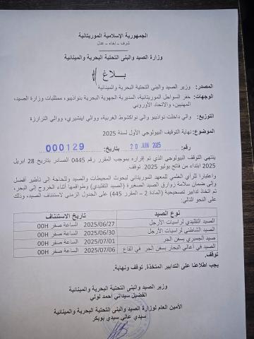 حددت وزارة الصيد والاقتصاد البحري والبنى التحتية البحرية والمينائية يوم الجمعة القادم، الموافق 27 يونيو 2025، موعدًا لاستئناف نشاط الصيد التقليدي في المياه الموريتانية، وذلك بعد فترة توقف موسمية.
