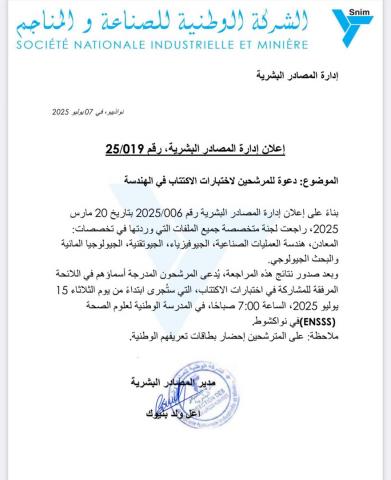 استدعت الشركة الوطنية للصناعة والمناجم (SNIM) عدداً من المترشحين لاجتياز المقابلات والاختبارات الفنية ضمن مسار التوظيف في عدة تخصصات، تشمل الهندسة والمالية وتقنيات المعلومات.