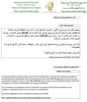 وقالت الهيئة في بيان إن الفترة ما بين الاثنين والخميس 14 إلى 17 يوليو الجاري ستكون الظروف خلالها ملائمة لتساقطات مطرية معتبرة قد تتراوح ما بين 50 إلى 150 مم في الحوضين ولعصابه وكيدي ماغه وكوركول ولبراكنه.