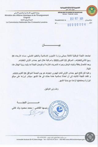 أعلنت لجنة مراقبة الأهلة، أن يوم غد الجمعة 24 من أكتوبر يوافق فاتح شهر جمادى الأولى (لبيظْ الوسطاني) من العام الهجري 1447.