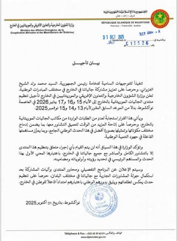 قررت وزارة الشؤون الخارجية والتعاون الإفريقي والموريتانيين في الخارج تأجيل تنظيم منتدى الجاليات الموريتانية في الخارج إلى يناير من عام 2026 بدلا من نوفمبر 2025 وكان من المقرر أن يقام المنتدى مابين 13-15 نوفمبر لكن الوزراة أعلنت في بيان تأجليه إلى 15 حتى 17 يناير 2026 في العاصمة نواكشوط .