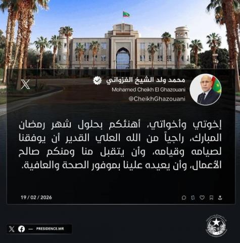 هنأ الرئيس محمد ولد الشيخ الغزواني، الموريتانيين بحلول شهر رمضان المبارك، راجيا من الله أن يوفق الجميع لصيامه وقيامه، وأن يتقبل صالح الأعمال، وأن يعيده على البلاد بموفور الصحة والعافية.