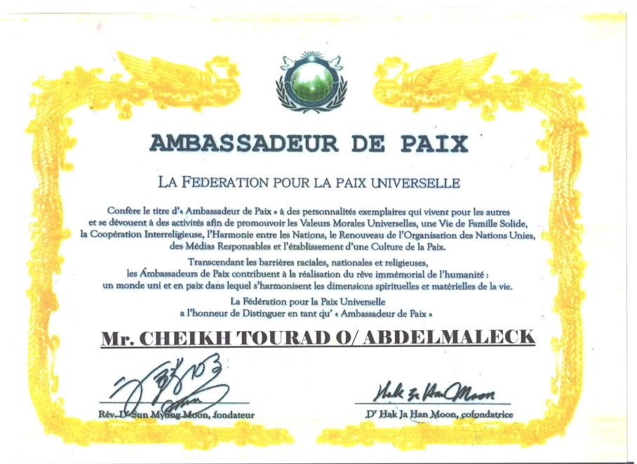 منح «اتحاد السلام العالمي»، الذي يوجد مقره في باريس، السيد الشيخ التراد ولد عبد المالك، مفوض حقوق الإنسان و العمل الإنساني، لقب «سفير السلام»؛ في العالم.