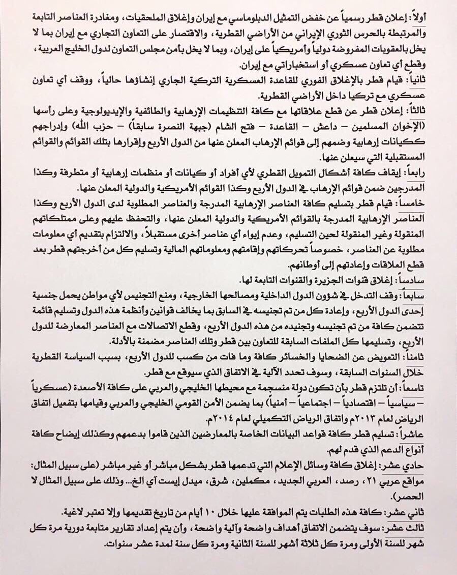الأمير سطام بن خالد آل سعود، أحد أفراد العائلة المالكة في المملكة العربية السعودية، نشر على حسابه الرسمي بتويتر ما وصفها بأنها قائمة مطالب من السعودية، والإمارات، والبحرين، ومصر لقطر لإنهاء الأزمة الراهنة. تتألف القائمة من 13 مطلبا بحسب تصريحات مسؤول بإحدى الدول الخليجية لوكالة رويترز , ولم يصدر حتى الآن تعليق رسمي قطري على تلك القائمة المفترضة.